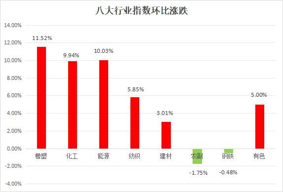 生意社监测的8 个行业,本周涨多跌少,高涨前三的隔离是橡塑行业,涨幅为10.23%,化工行业,涨幅为9.39%,动力行业,涨幅为5.78%。下降的是有色行业,跌幅为-1.91%。